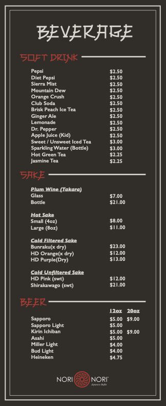 As you dine, you might be tempted to leave room for dessert, and Nori Nori has you covered. Indulge in a slice of their creamy Cheesecake or savor the delightful notes of Green Tea Ice Cream, both of which are perfect for rounding off your meal on a sweet note.